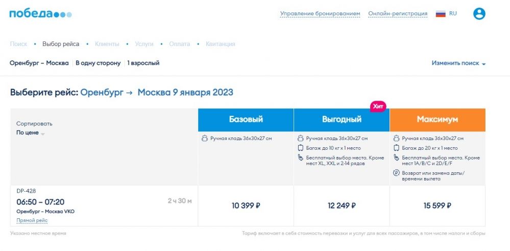 Так, за прямой перелет до Москвы утром 9 января желающим придется заплатить 10 399 рублей за базовый тариф и 12 249 за тариф выгодный. Однако напомним, что в ноябре 2022 года лоукостер сообщал следующие цены на билеты: из Оренбурга в Москву 5 999 — на 7 января и 9 299 — на 8 января. Из столицы в Оренбург 3699 рублей в любой из дней с 3 по 8 января, и 2 000 — в первый рабочий день 9 января.