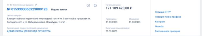 Объявлен аукцион на благоустройство улицы Советской в Оренбурге – от ул. Володарского до ул. Набережной. На сайте госзакупки размещены два лота. Максимальная стоимость контракта составляет более 309 млн рублей. Источниками финансирования указаны городской, областной и федеральный бюджеты.