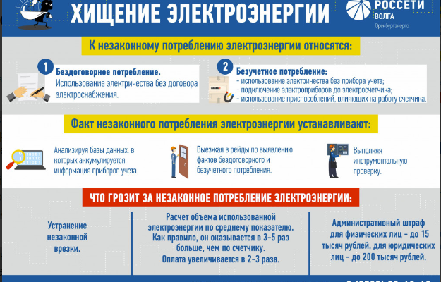Энергетики филиала ПАО «Россети Волга» – «Оренбургэнерго» ведут системную работу по пресечению и профилактике хищений электроэнергии. Безучетное и бездоговорное потребление электроэнергии, а также самовольное подключение к электрическим сетям является административным правонарушением и неизбежно влечет за собой наказание. Дела о привлечении к административной ответственности рассматривались по статье 7.19 КоАП РФ «Самовольное подключение и использование электрической, тепловой энергии, нефти или газа».