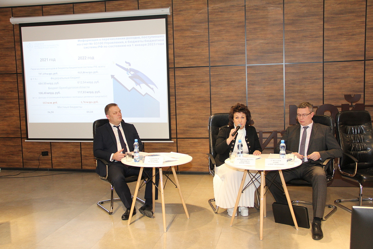 9 февраля 2023 года руководитель УФК по Оренбургской области Л.Б. Арцыбашева приняла участие в работе расширенного заседания коллегии министерства финансов Оренбургской области и выступила с докладом на тему «Казначейское обслуживание исполнения бюджета Оренбургской области в 2022 году».