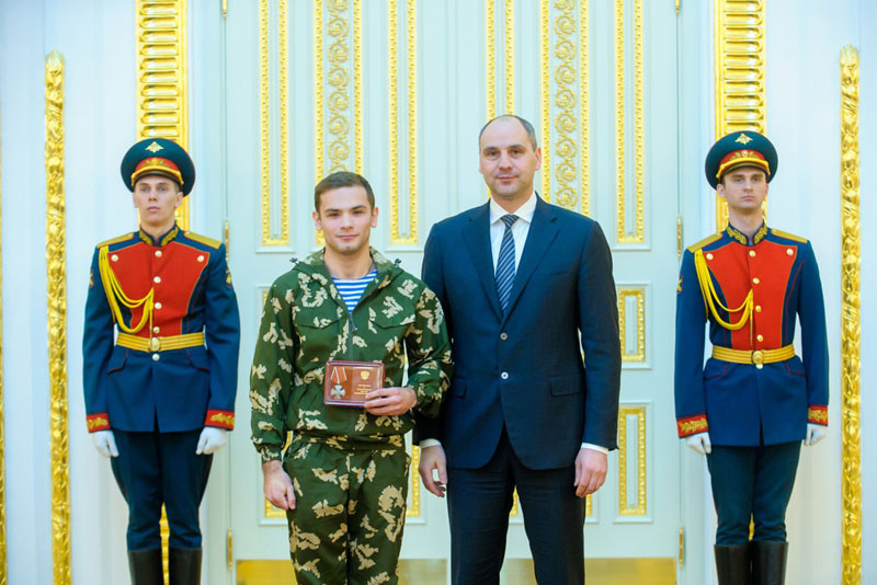 Ведомственную награду Министерства обороны Российской Федерации - медаль «За боевые отличия» - губернатор вручил младшим сержантам Самату Дузбаеву и Алексею Москалеву, ефрейтору Рамису Мулюкову, рядовым Тамерлану Бигалееву, Аманжолу Имангулову, Дмитрию Фомичеву.