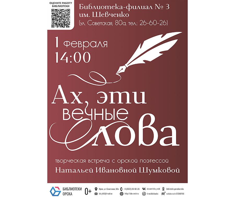 1 февраля в 14 часов – встреча с орской поэтессой Натальей Шумковой «Ах, эти вечные слова!..» (0+).