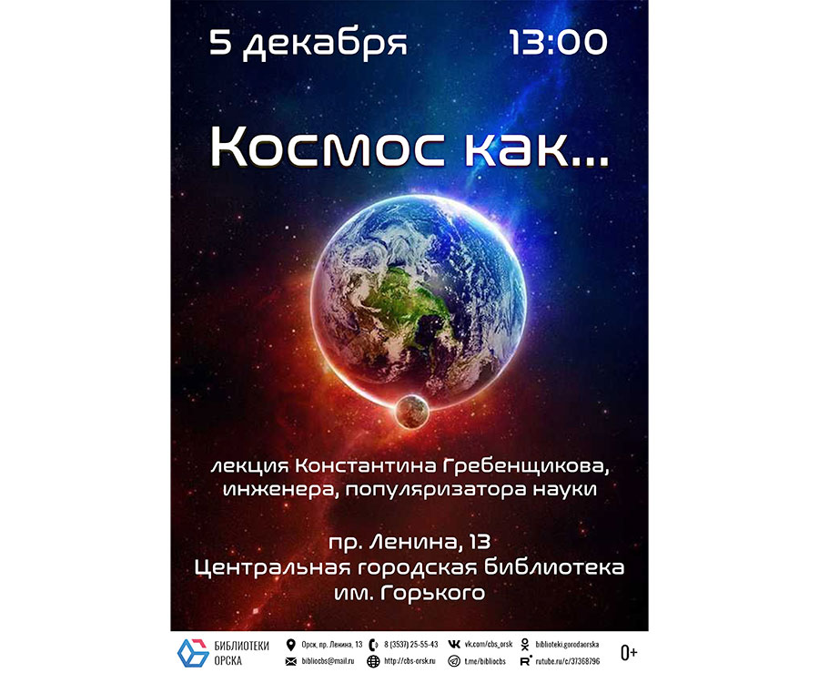 5 декабря в 13 часов в Центральной городской библиотеке пройдет лекция инженера и популяризатора науки Константина Гребенщикова на тему «Космос как…». Это мероприятие станет отличной возможностью для всех желающих узнать больше о загадках вселенной и последних достижениях в области космических исследований.