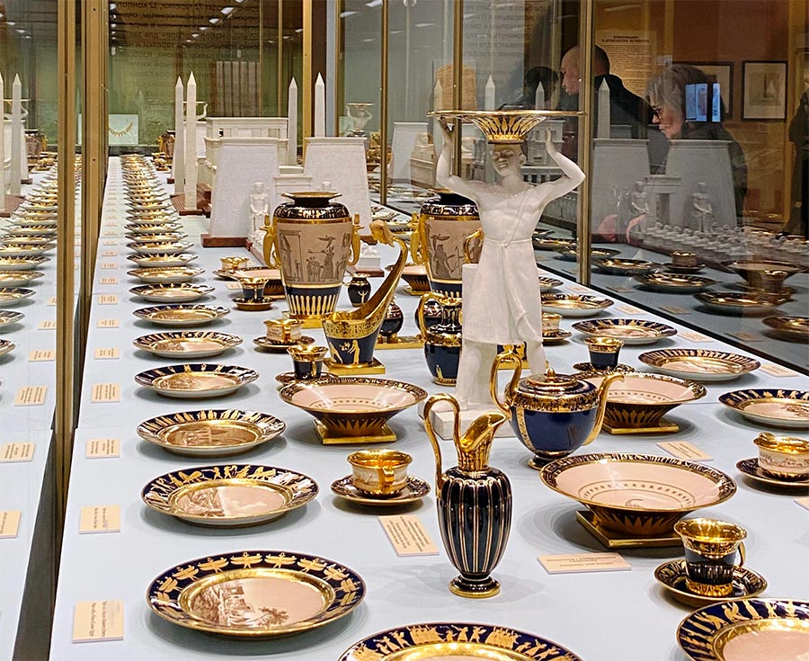 Потрясает воображение египетский сервиз, занимающий четверть зала. Можно долго рассматривать тарелки, на каждой из которых – какой-нибудь сюжет из жизни египтян. В центре стола с посудой выстроен целый храмовый комплекс, характерный для египетской архитектуры, с пирамидами и стелами. Думаю, люди, сидевшие за таким столом, чувствовали себя фараонами или их приближенными.