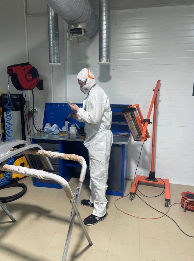 Окрашивали детали автомобиля. Конкурсные задания распределили в три дня. Первым было – устранить дефект(царапину) бампера и выполнить окраску детали с переходом цвета «снежка». Оказывается, окраску в светлые тона выполнить сложнее, чем в тёмные. На следующий конкурсный день устраняли дефект (вмятину) на крыле автомобиля, шпаклевали и окрашивали с переходом тёмно-зелёного оттенка. Кстати, на бампер уделялось четыре часа работы, на крыло – два. Третье задание – устранение царапины на крыле и полная окраска крыла автомобиля. Рабочие инструменты Евгения – краскопульт, покрасочная камера, шлифовочная машинка, шпатели, наждачная бумага.