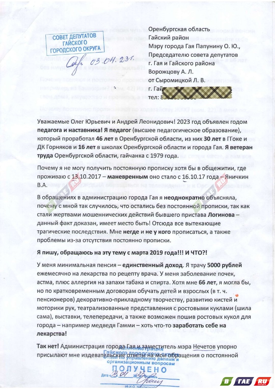 История гайчанки Л.В. Сыромицкой продолжает набирать обороты, а вместе с тем множатся многочисленные ответы из разных инстанций. Пожалуй, они составят уже целую книгу. Суть - в гайской прописке. Любовь Владимировна Сыромицкая проживает в Гае с 1979 года. Трудовой стаж Л.В. Сыромицкой составляет 45 лет. Любовь Владимировна считает, что она имеет полное право на прописку в Гае. В частности, в комнате маневренного жилья. В 2014 году утратила свое единственное жилье из-за кредитов и в настоящее время проживает в муниципальном общежитии по временной прописке. А поэтому при небольшой пенсии не может приобрести квартиру, без постоянной прописки - пользоваться социальными льготами.