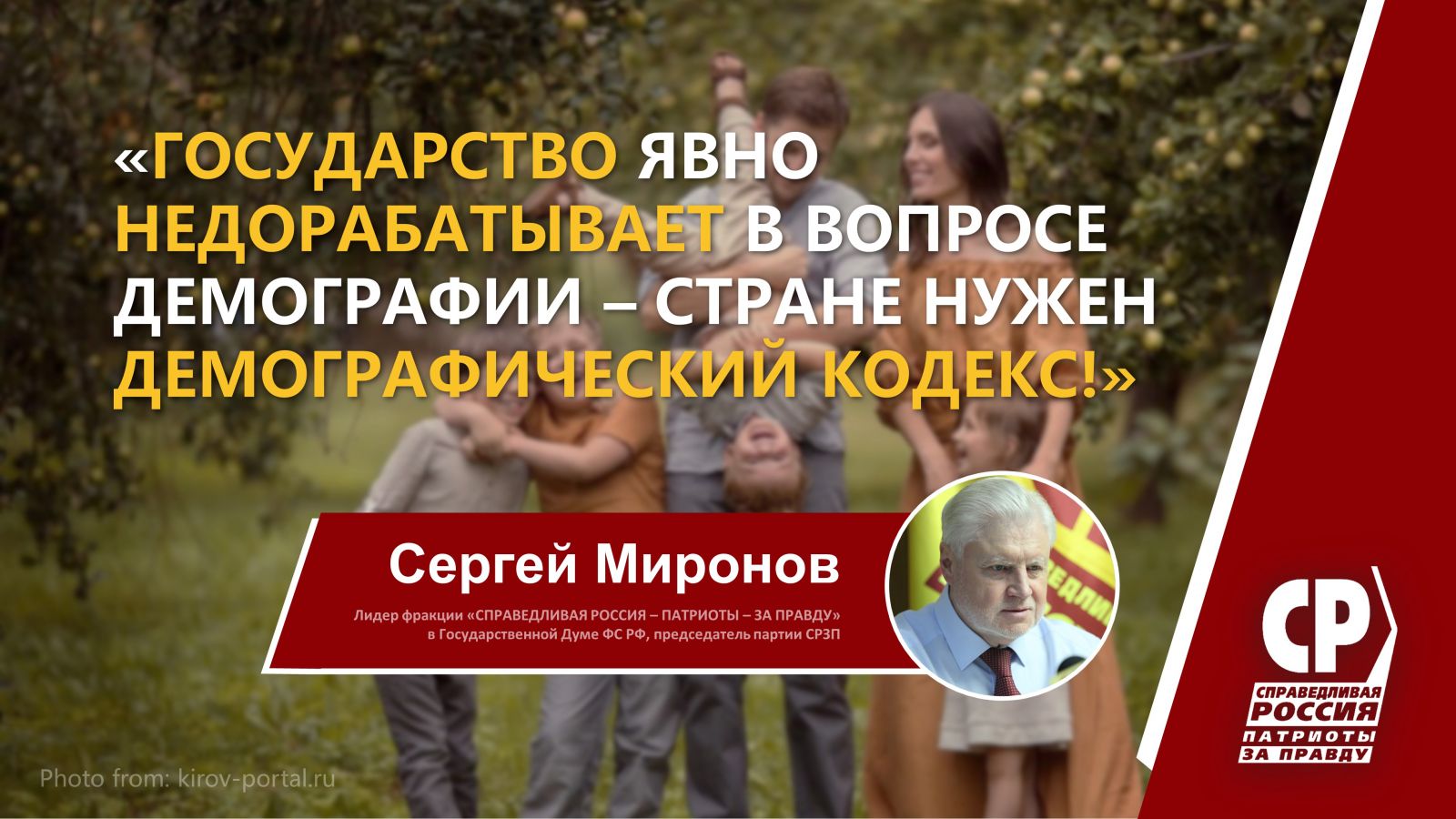У фракции СРЗП есть пакет программных предложений по улучшению демографии: мы настаиваем на введении прогрессивной шкалы мат.капитала (платить больше за каждого последующего ребёнка, сейчас крупнейшая выплата – за первенца), нам важно решить жилищный вопрос – ипотека даже под 6% его не решает, поэтому для семей с детьми нужно снижать ставку минимум вдвое, мы также призываем к увеличению выплат семьям с детьми, развитию социальной сферы, дополнительным вливаниям в здравоохранение и образование... Для воспроизводства населения нам нужно стимулировать не просто рождаемость, а многодетность – это должно стать национальной целью!