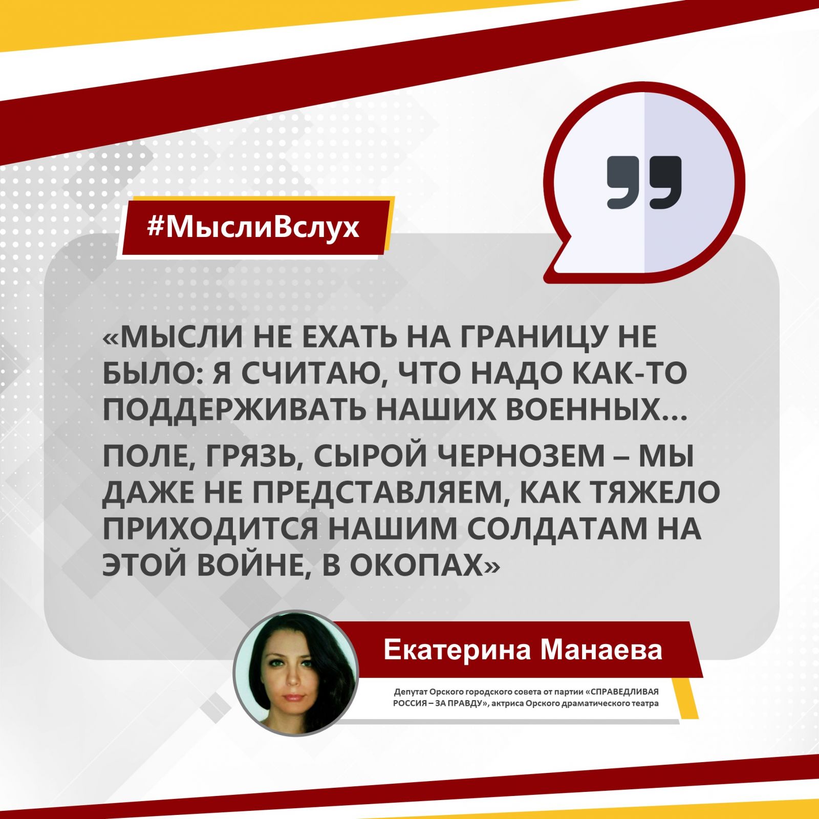 Екатерина Манаева, депутат Орского городского Совета от партии СПРАВЕДЛИВАЯ РОССИЯ – ЗА ПРАВДУ по основному роду деятельность является актрисой Орского драматического театра. Недавно в составе труппы драмтеатра Екатерина Манаева находилась на гастролях в прифронтовой зоне, в городе Новочеркасск, где актеры выступили с репертуаром театра. Самыми благодарными зрителями были наши бойцы, которые вернулись или только отправляются оттуда в зону проведения спец.операции.
