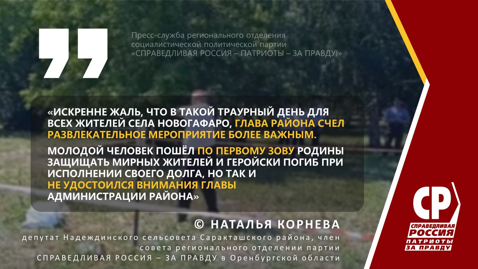 Депутат Надеждинского сельсовета Саракташского района, член совета регионального отделения СПП СПРАВЕДЛИВАЯ РОССИЯ – ЗА ПРАВДУ Наталья Корнева выразила свои глубочайшие соболезнования родителям, родственникам, друзьям погибшего героя.