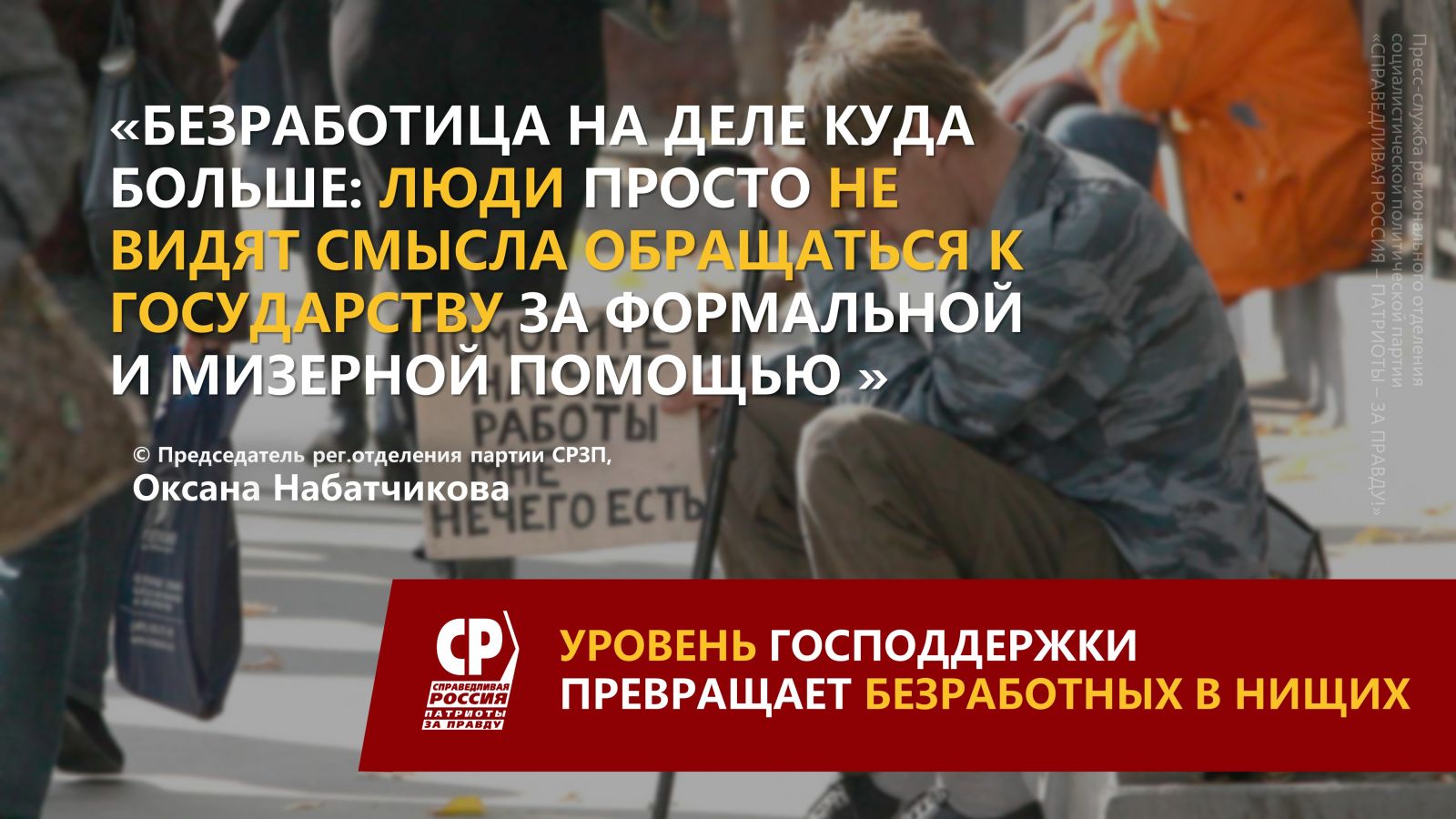 Председатель рег.отделения партии Оксана Набатчикова отмечает: безработица на деле куда больше заявленных 1-3% – люди просто не видят смысла обращаться к государству за такой формальной и мизерный помощью. Именно этим и объясняются рекордно низкие цифры официальной безработицы.