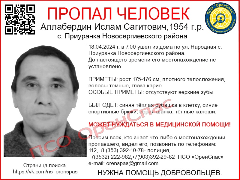 Всех, кто знает что-либо о местонахождении пропавшего или видел его, просят позвонить по телефонам: 112, 8 (353) 392-10-78- полиция, +7(3532) 222-982, +7(903)392-29-82 ПСО «ОренСпас» e-mail: [email protected].