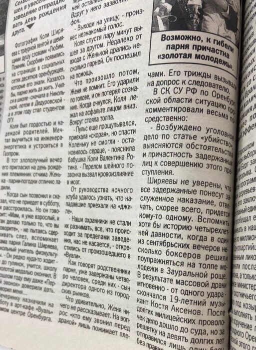 В тот сентябрьский вечер 2011 года Николай пришел в клуб “Вуаль” на день рождения к своему знакомому, через несколько часов (по некоторой информации, после телефонного звонка), он вышел на улицу, где его начали избивать неизвестные, подъехавшие на джипе. От полученных травм головы потерпевший скончался на месте происшествия, а агрессивная молодежь, напавшая на парня, уехала на машине. Газеты тогда подробно описывали все, что произошло в ту ночь, сообщая, что к смертельному избиению парня могли быть причастны сыновья одного из предпринимателей областного центра.