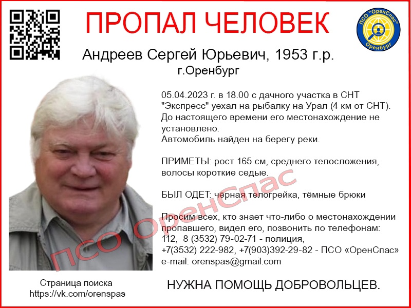 Всех, кто что-либо знает о местонахождении пропавшего или видел его, просят позвонить по телефонам: 112, 8 (3532) 79-02-71 — полиция, +7(3532) 222-982, +7(903)392-29-82 — ПСО «ОренСпас» e-mail: [email protected]