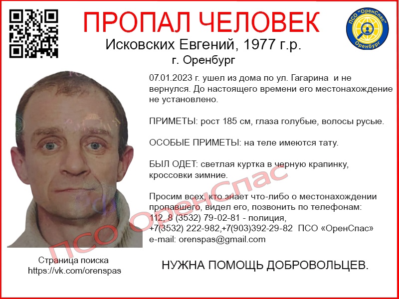 Всех, кто что-либо знает что-либо о местонахождении пропавшего или видел его, просят позвонить по телефонам: 112, 8 (3532) 79-02-81 — полиция,+7(3532) 222-982,+7(903)392-29-82 ПСО «ОренСпас».