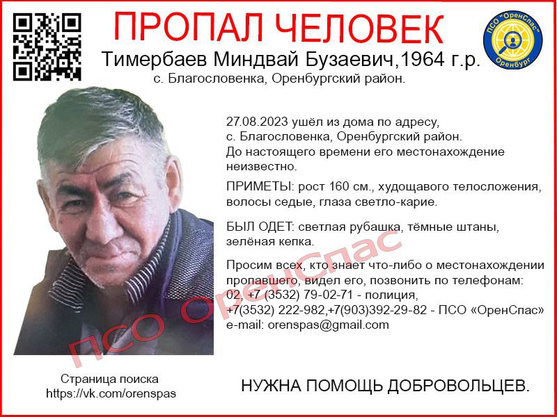Известно, что Миндвай Тимербаев ушел из дома в селе Благословенка 27 августа. До настоящего время место его нахождения неизвестно.
