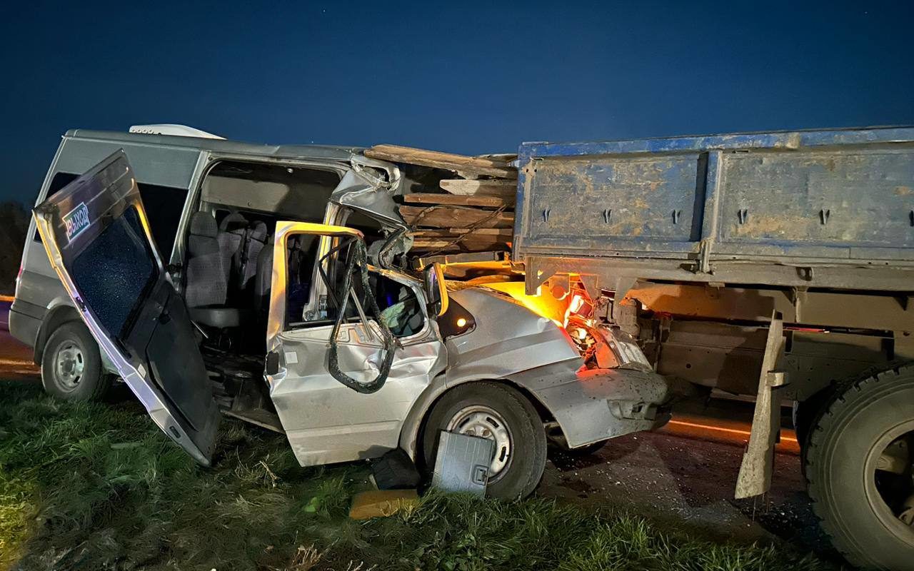 Столкнулись «КАМАЗ» и автомобиль «Форд Транзит», перевозивший пассажиров. По предварительным данным, водитель микроавтобуса «Форд» не справился с управлением.