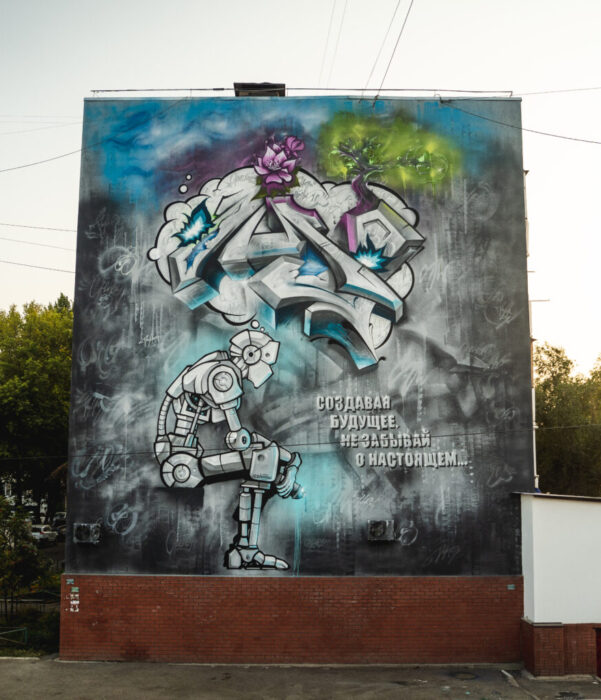 С работами художника и участника фестиваля «ФормART» Дмитрия Сумбаева оренбуржцы уже знакомы. Он оформлял граффити скейт-площадку на Набережной. Его творение изображено на здании №44 по улице Волгоградской, об этом писал Orengrad .