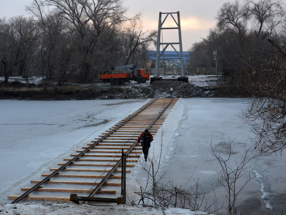 – Наконец лед достиг нужной толщины – 300 миллиметров, – сообщил мастер участка Владимир Куликов. – На всякий случай подморозили его еще на 100 миллиметров и приступили к работам. Начали устройство гати под временную эстакаду. Одновременно с этим монтируем канатно-вантовую систему со стороны улицы Строителей.