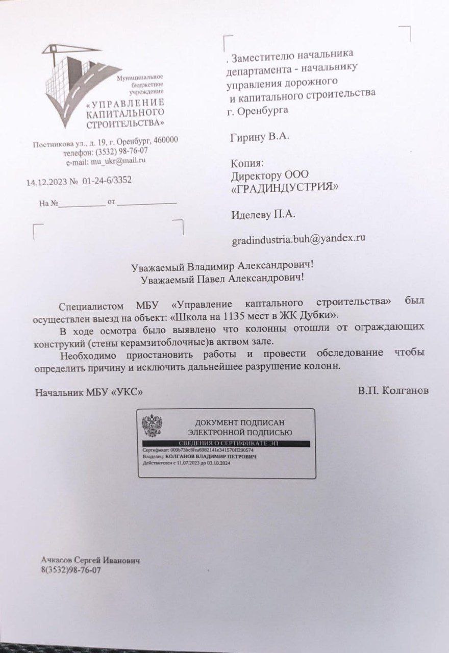 Какие именно проблемы были выявлены в новой школе в ЖК «Дубки»? Насколько серьезны выявленные дефекты? Какие меры предполагается предпринять для устранения дефектов? Какие средства были заложены на строительство данной школы? Будет ли она сдана в 2024 году с учетом выявленных дефектов?На официальный запрос мы получили о̶т̶п̶и̶с̶к̶у̶ ответ, после которого вопросов возникло еще больше. Начальник управления администрации Оренбурга Гирин сообщает, что выявленные дефекты незначительные и школу введут в эксплуатацию на следующей неделе.
