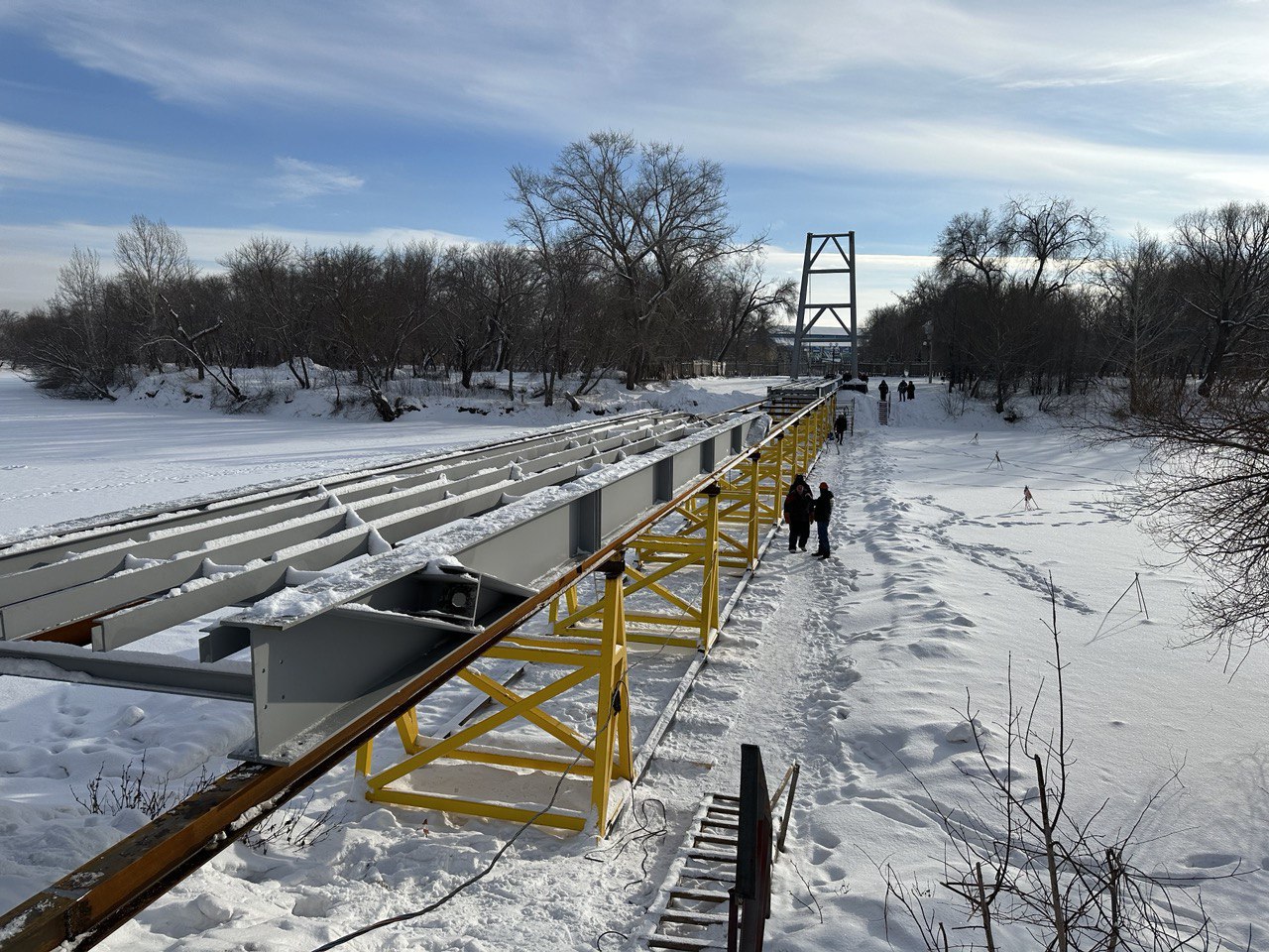 Будут установлены 5 пролетов для пешеходной зоны, ширина которой составит 2,5 метра. Общая длина моста превысит 70 метров. К июню подрядчик благоустроит прилегающую территорию. Кроме того, будут обустроены входная группа с улицы Строителей и подъездные пути к парку.