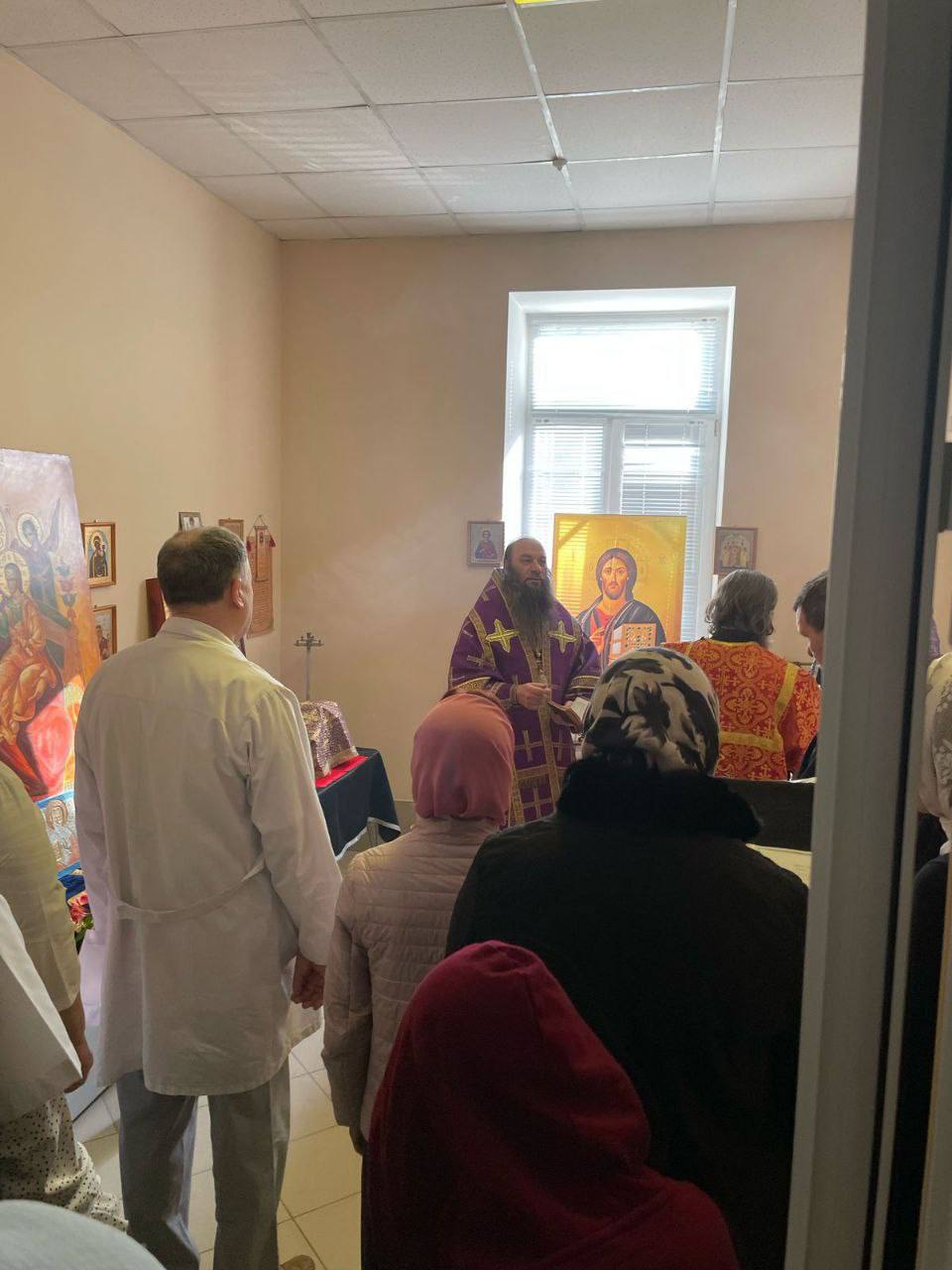 Его Преосвященству сослужили ответственный за окормление этого больничного учреждения священник Вячеслав Коротков и клирик Свято-Георгиевского кафедрального собора Орска архидиакон Викентий (Геницэ).