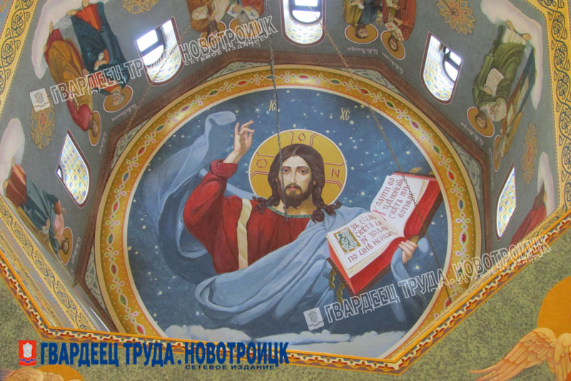 Роспись начали с купольной части храма, на которой был изображен Господь Благословляющий. На стенах изображены мировые и отечественные святые, а также Архангел Гавриил и Дева Мария. В центральной части алтаря – сцена тайной вечери, а на клиросе – роспись «Снятие Иисуса Христа с креста».