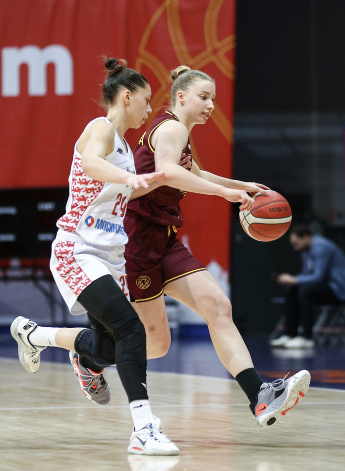 Счет в матче открыла Алиса Лацгаль, но тут же и МБА забили свои первые очки. Затем на протяжении всей четверти шла вязкая борьба и ни одна из команд не вырывалась более, чем на 3 очка. Лишь в концовке первого игрового отрезка Мария Крымова в проходе вывела МБА на 5 очков вперед. (18:13)