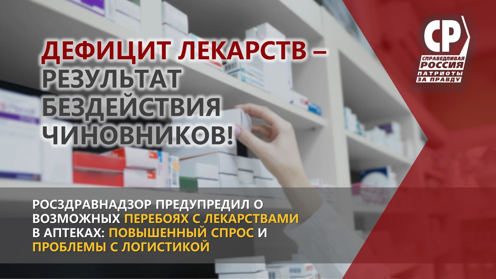 На днях Росздравнадзор предупредил о возможных перебоях с лекарствами в аптеках, объяснив это повышенным спросом и проблемами с логистикой, сама же угроза лекарственного дефицита, нарастающая с начала пандемии, до сих пор не встречает должной реакции со стороны Правительства.