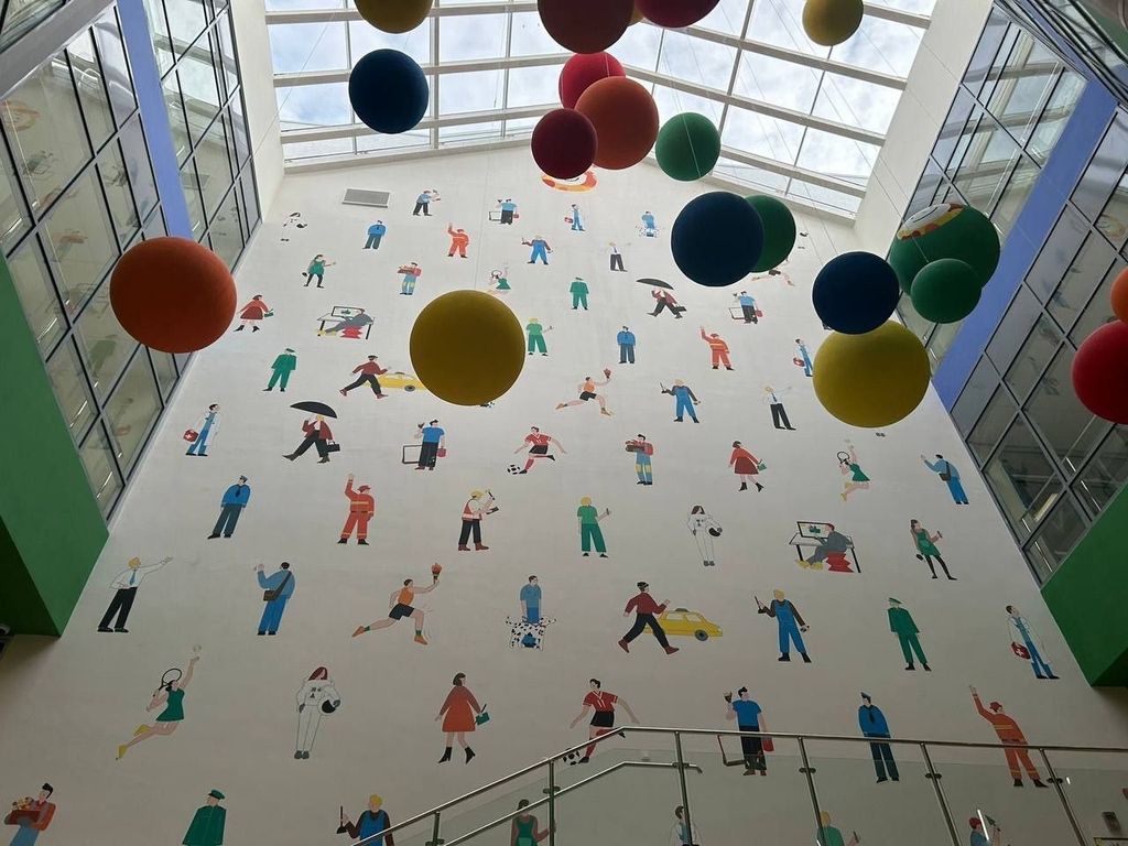 Минздрав и больница совместно с дизайнерами работают над навигацией в поликлинике. Начат монтаж гардероба. Декораторы закончили роспись основной стены холла, здесь устанавливают мебель. Эта локация будет очень яркой и позитивной для маленьких пациентов и их родителей, - рассказала вице-губернатор по социальной политике – министр здравоохранения Оренбургской области Татьяна Савинова.Холл в новой больнице. Фото: Минздрав Оренбургской области