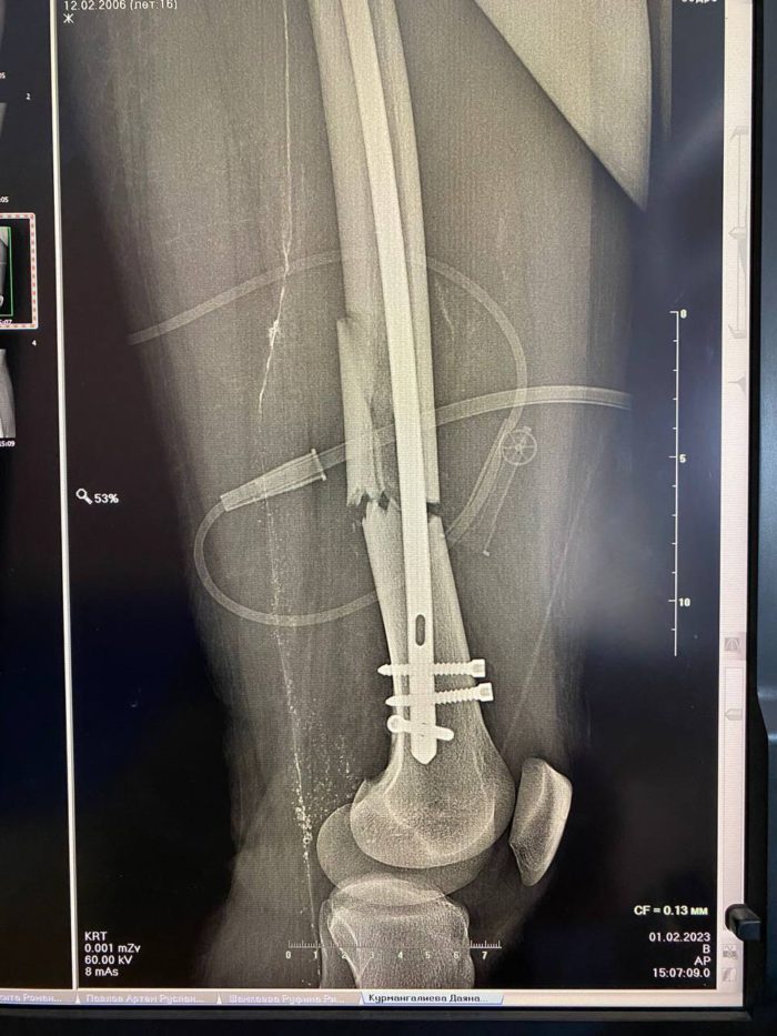 Пациенту провели болокираванный интрамедуллярный стержневой остеосинтез. Спустя два дня ребенок смог вставать на костыли. Боль уменьшилась, отек начал спадать. Через неделю подростка надеются выписать из больницы.