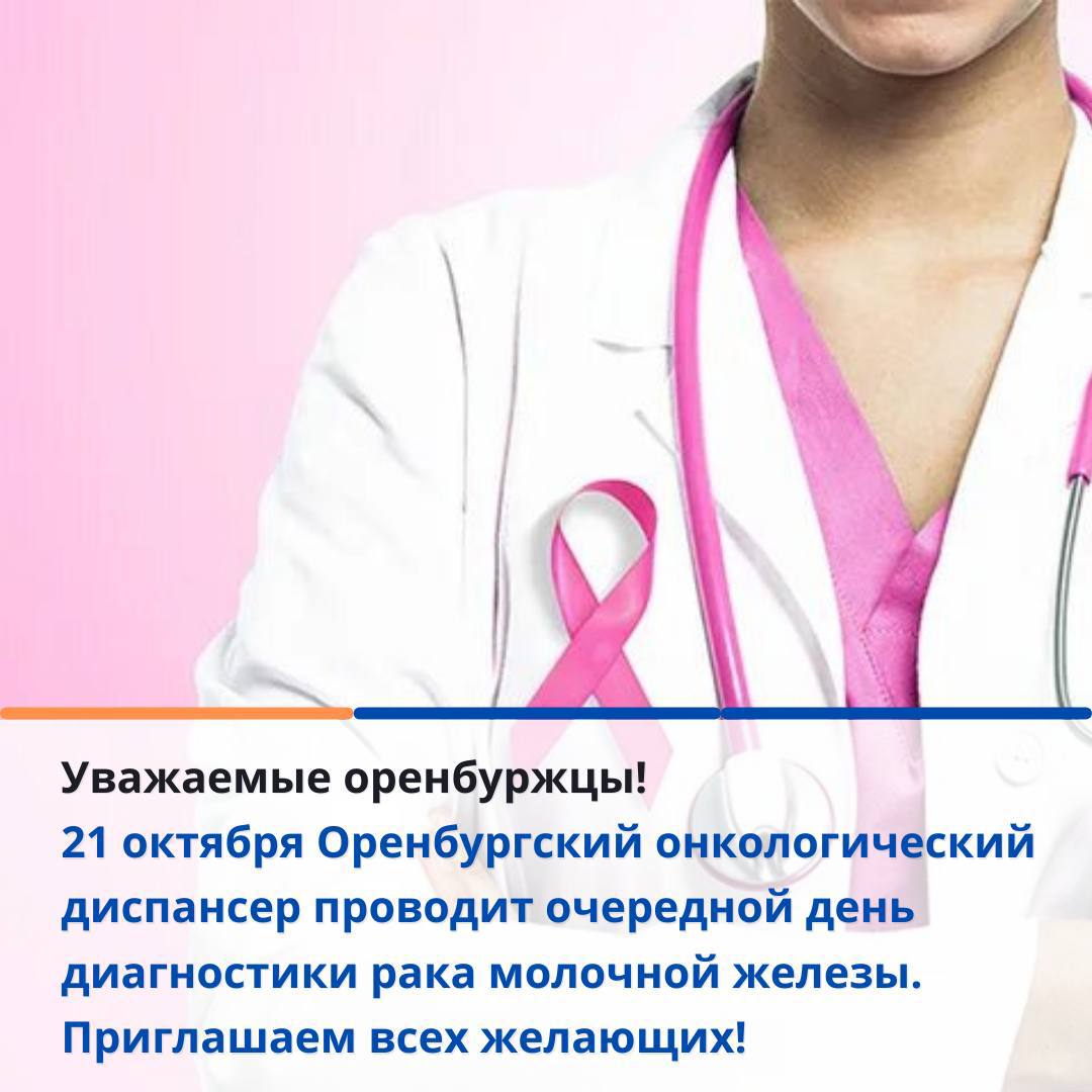 21 октября в поликлинике Оренбургского областного онкологического диспансера на проспекте Гагарина, 11 будут организованы бесплатные приемы опытных врачей-маммологов и маммография.