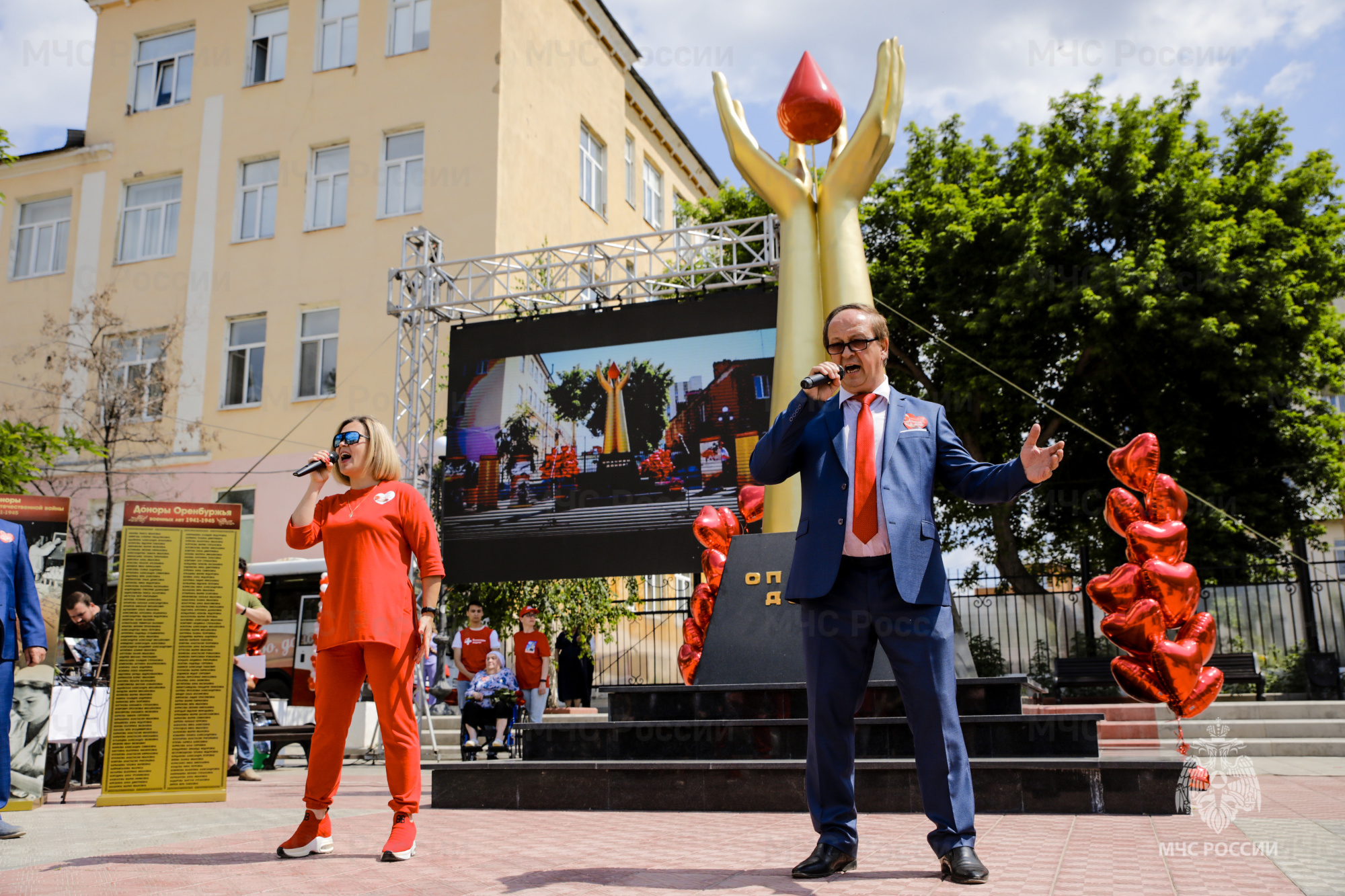 В рамках празднования Всемирного дня донора крови, прошедшего у памятника донорам на улице Советской под лозунгом «Спасибо, наставник-донор!», солисты группы «Встреча» ГУ МЧС России по Оренбургской области спели о донорах,