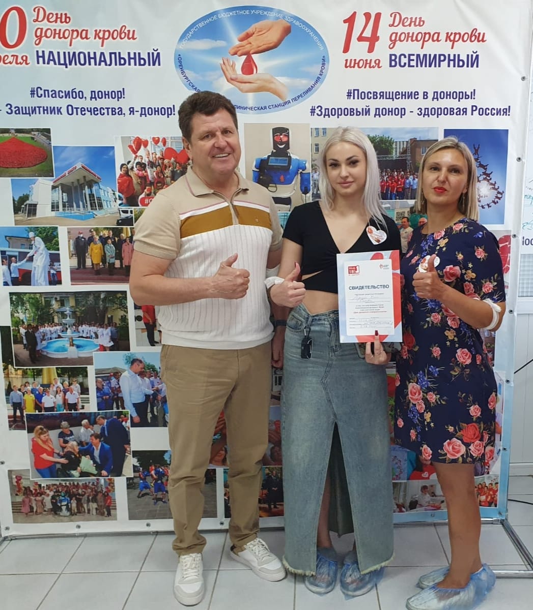 Главный врач Оренбургской станции переливания крови, заслуженный врач РФ. к.м.н. Ринат Гаптрауфович Гильмутдинов вручил Юлии Лукиных свидетельство и поздравил с Днем донорского совершеннолетия.