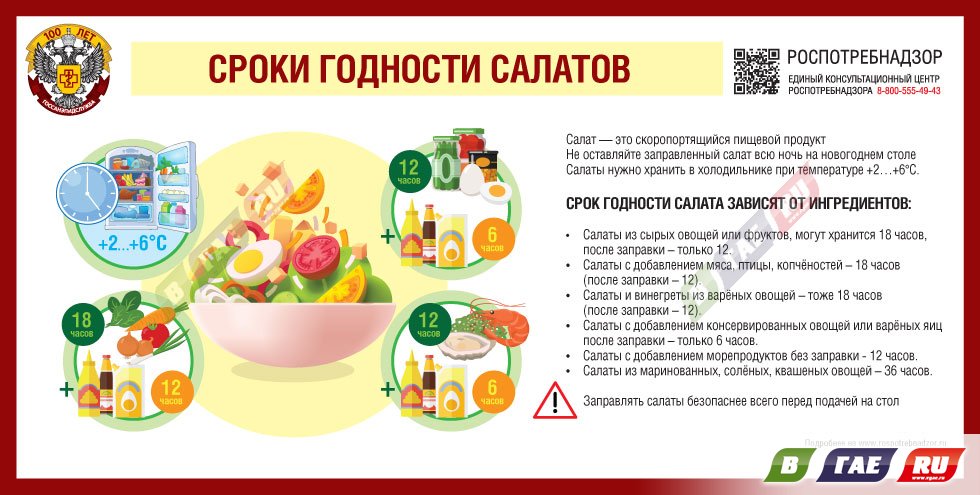 Салаты из сырых овощей или фруктов могут хранится 18 часов, после заправки – только 12; Салаты с добавлением мяса, птицы, копчёностей – 18 часов (после заправки – 12); Салаты и винегреты из варёных овощей – 18 часов (после заправки – 12); Салаты с добавлением консервированных овощей или варёных яиц после заправки – только 6 часов; Салаты с добавлением морепродуктов без заправки – 12 часов; Салаты из маринованных, солёных, квашеных овощей – 36 часов;Последние новости