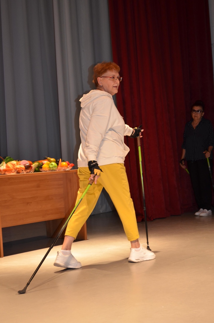 Врач по медицинской профилактике, демонстрируя правила и технику скандинавской ходьбы, убедила многих заняться этим видом физической культуры.
