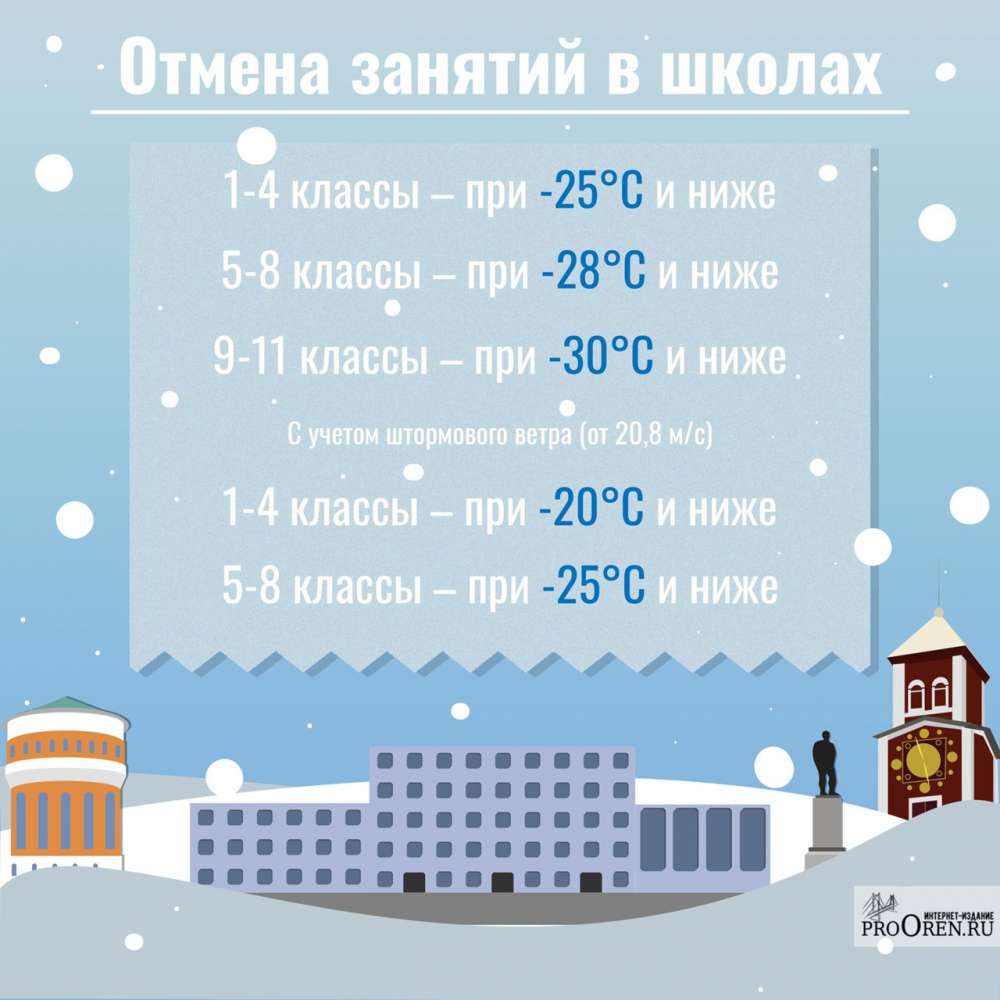 В мэрии Оренбурга отметили, что в сильный мороз дети могут остаться дома, так как есть риски получить переохлаждение или даже обморожение. Однако для разных классов действуют разные условия. В управлении образования администрации напомнили, при каких температурах школам рекомендовано отменить учебные занятия: