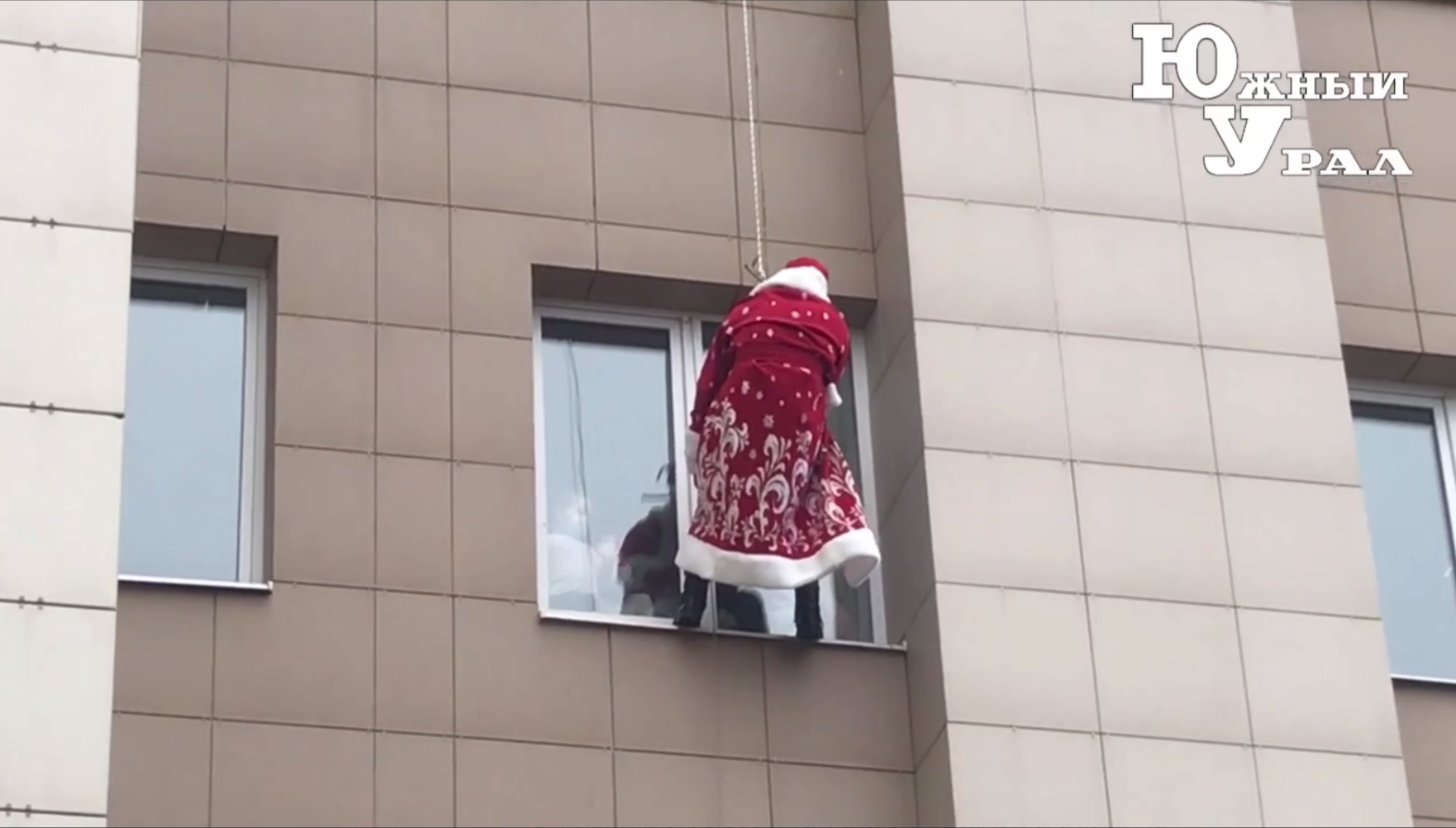 Альпинист из Всероссийского студенческого корпуса спасателей в костюме Деда Мороза спустился с крыши диспансера на специальных приспособлениях. И конечно поздравил юных пациентов с наступающим Новым годом.