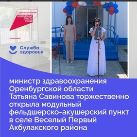 Нацпроект «Здравоохранение» успешно реализуется в Оренбургской области: еще в одном селе — селе Веселый Первый Акбулакского района — возведен новый модульный медпункт. В торжественном мероприятии приняла участие вице-губернатор — заместитель председателя Правительства Оренбургской области по социальной политике — министр здравоохранения Татьяна Савинова.