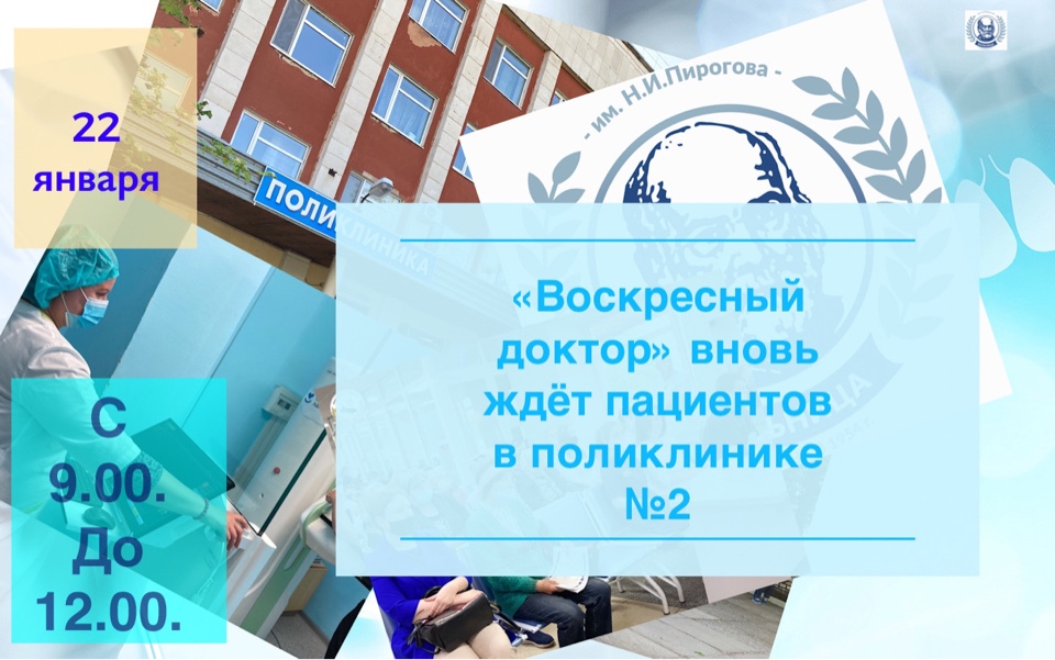 22 января 2023 года в рамках программы «Воскресный доктор» на базе поликлиники №2 ГКБ им. Н. И. Пирогова можно будет пройти диспансеризацию