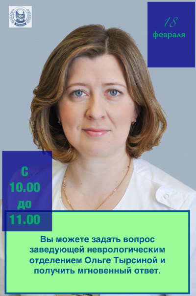 Уважаемые пациенты в вашей «народной больнице» в субботу, 18 февраля, с 10.00 до 11.00 часов пройдёт Прямая линия с заведующей неврологическим отделением ГАУЗ «ГКБ им. Н. И. Пирогова Ольгой Тырсиной.