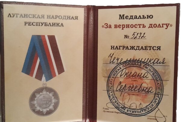 Медаль «За верность долгу». Источник: Минздрав Медсестра-анестезист Оксана Чечельницкая из ГАУЗ «Орский онкологический диспансер» получила медаль за профессионализм, верность долгу и оказание медпомощи помощи жителям ЛНР.