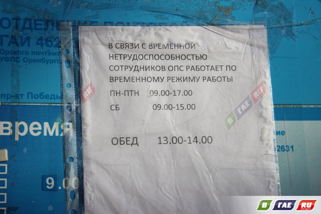 В коллективе почтового отделения "Гай 5" сменился режим работы. Причина - заболеваемость сотрудников. При входе на почтовое отделение появилось объявление, предупреждающее посетителей о том, что в связи с временной нетрудоспособностью сотрудников ОПС работает по временному режиму работы.