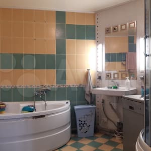 Просторный санузел с угловой ванной и душевой кабиной, в котором свободно помещается стиральная и посудомоечная машины.